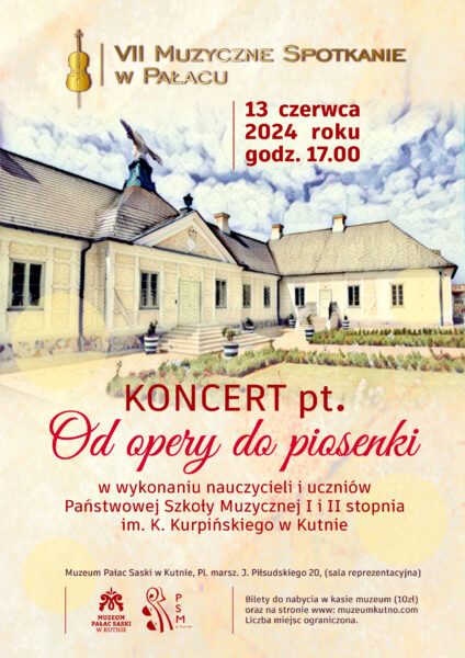 Miło nam poinformować, że 13.06. odbędzie się koncert wieńczący cykl: „Muzyczne Spotkanie w Pałacu”. Wraz z przedstawicielami Państwowej Szkoły Muzycznej I i II st. im. K. Kurpińskiego w Kutnie zapraszamy do Muzeum Pałacu Saskiego w Kutnie na godz. 17:00. Szczegóły odbywającego się wydarzenia znajdują się na plakacie poniżej: