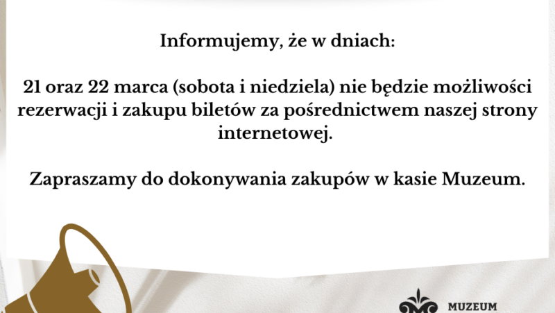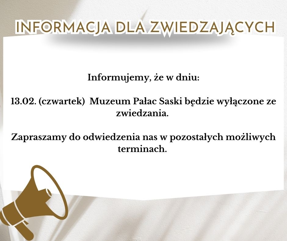 Informujemy, że 13.02. (czwartek) w Muzeum Pałacu Saskim wyłączona będzie możliwość zwiedzania. Za utrudnienia przepraszamy i zapraszamy do odwiedzenia nas w pozostałych terminach.