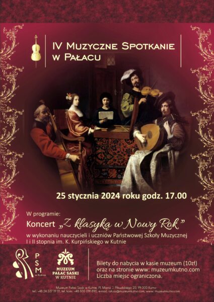 Miło nam poinformować, że wracamy z kolejną edycją koncertów w ramach Muzycznych Spotkań w Pałacu. Tym razem uczniowie i nauczyciele z Państwowej Szkoły Muzycznej I i II stopnia im. K. Kurpińskiego w Kutnie wystąpią 25.01. o godz. 17:00 Bilety do nabycia w Muzeum Pałacu Saskim w godzinach otwarcia kas. Zapraszamy!
