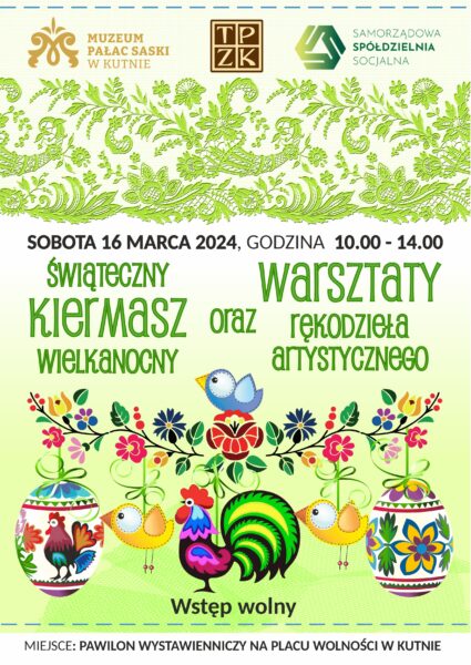 Kolejne wydarzenie w marcu! Powoli witamy wiosnę i przygotowujemy się do Wielkanocy. Na sobotę, 16 marca, zaplanowany jest świąteczny kiermasz wielkanocny oraz warsztaty rękodzieła artystycznego. Organizatorzy: Muzeum Pałac Saski, Towarzystwo Przyjaciół Ziemi Kutnowskiej oraz Samorządowa Spółdzielnia Socjalna, serdecznie zapraszają do wzięcia udziału w wydarzeniu! Wystarczy pojawić się między 10:00 a 14:00 w pawilonie wystawienniczym na Placu Wolności w Kutnie i skorzystać z przygotowanych atrakcji – wstęp wolny!