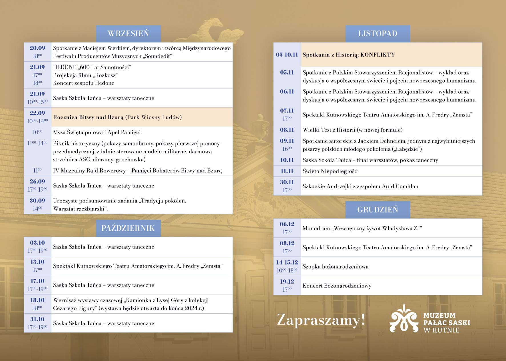 Muzeum Pałac Saski przygotowało na najbliższy czas wiele atrakcji. Oprócz regularnego zwiedzania mamy propozycje koncertów, wykładów naukowych, spotkań z ciekawymi osobami czy spektakli. Poniżej plan na najbliższe miesiące. Przypominamy, że bilety na wydarzenia można kupić w kasie muzeum, w godzinach jego otwarcia oraz za pośrednictwem strony internetowej w zakładce „Kup bilet„.