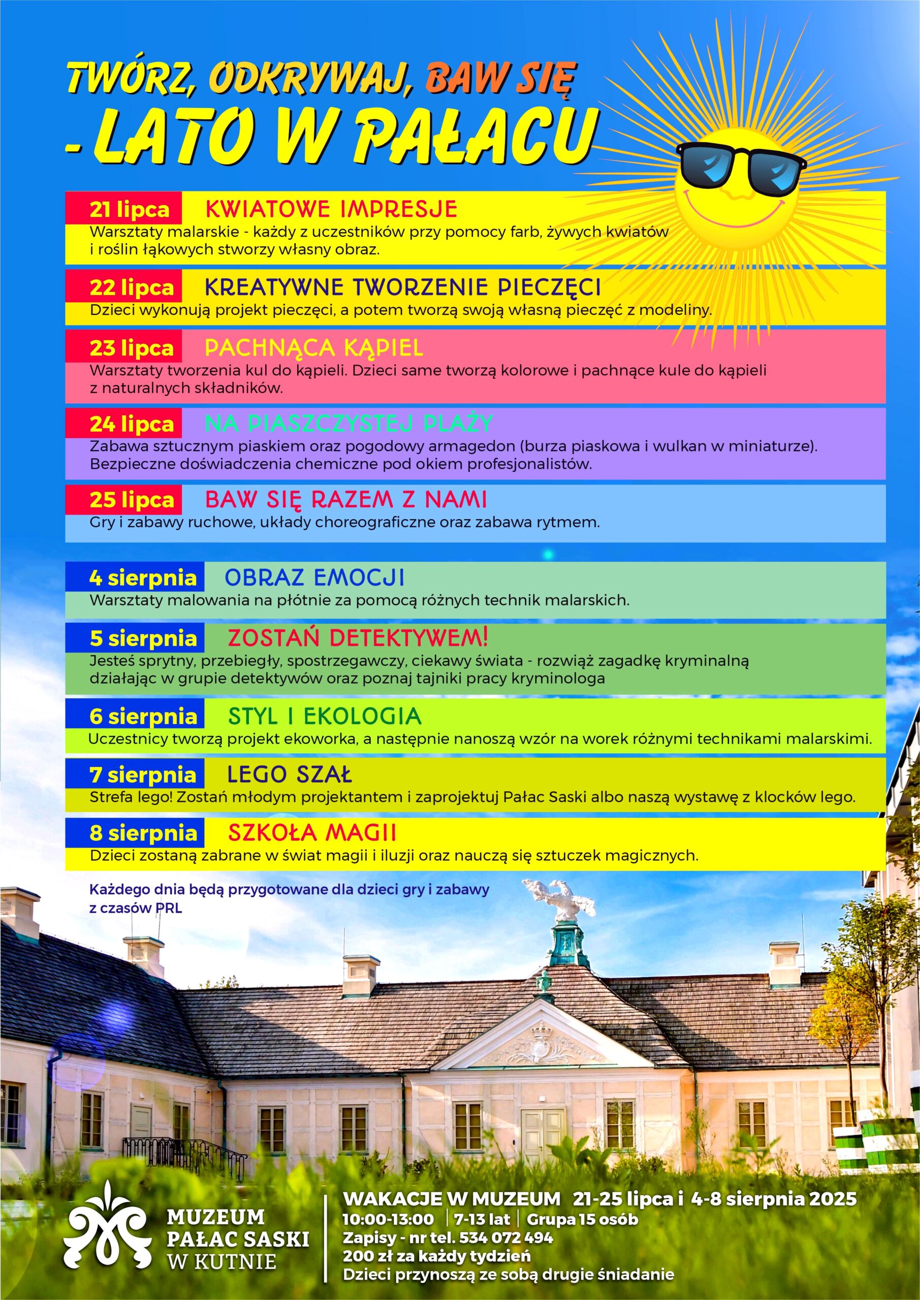 Zakończenie roku szkolnego już za nami, a my zapraszamy na fascynujące Wakacje w Muzeum! Na najmłodszych czekają 2 tygodnie pełne atrakcji. W lipcu będą to dni od 21 do 25, natomiast w sierpniu od 4 do 8. Zapraszamy dzieci w wieku 7-13 lat. Obowiązują zapisy według kolejności zgłoszeń. Kontakt prosimy pod nr tel.- 534 072 494