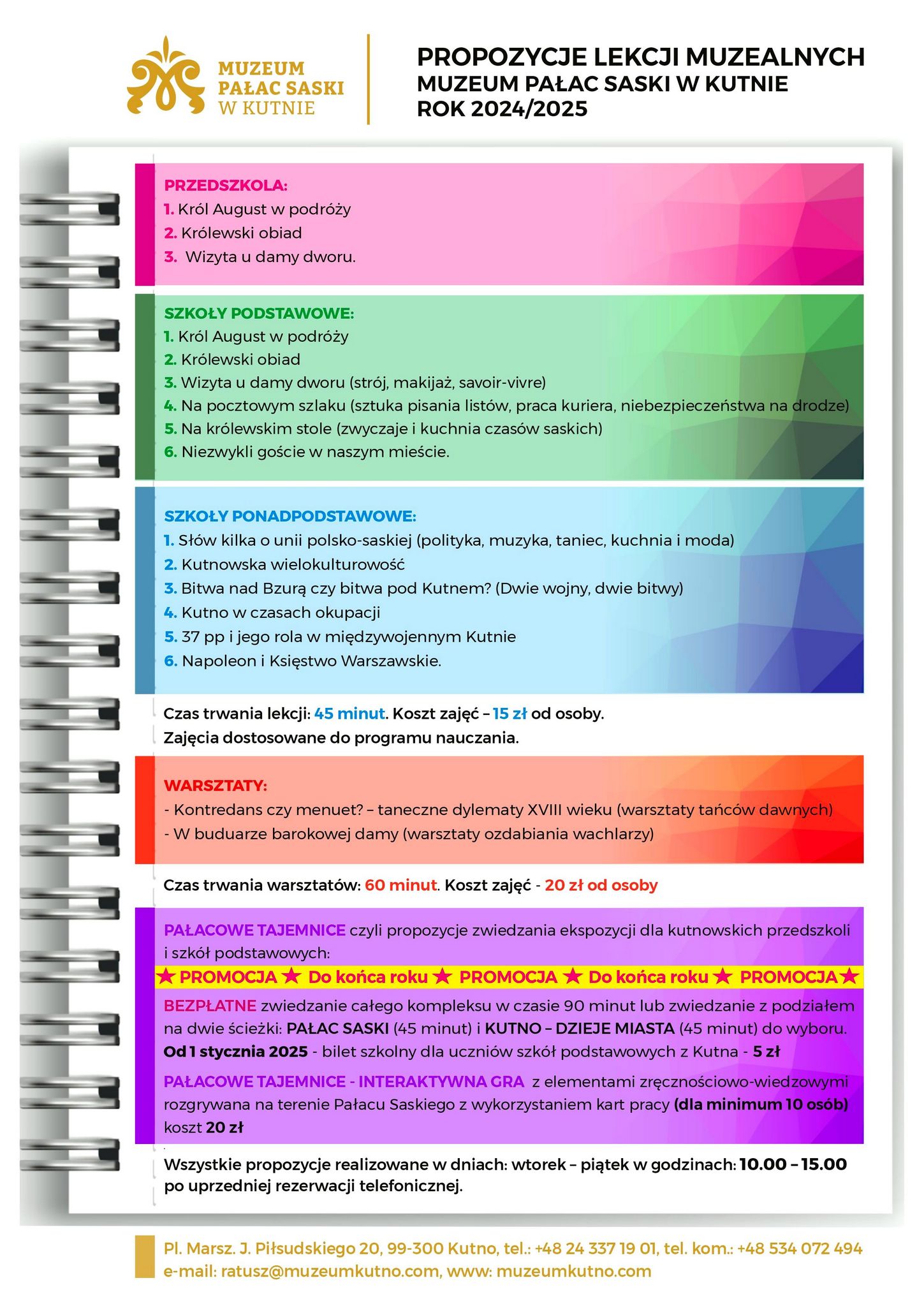 Rozpoczął się rok szkolny, w związku z czym przybywamy do Państwa z propozycjami lekcji muzealnych na rok szkolny 2024/25. Zapraszamy przedszkola, szkoły podstawowe i ponadpodstawowe do udziału w proponowanych zajęciach. Udział w nich możliwy jest po dokonaniu uprzedniej rezerwacji telefonicznej. Szczegóły poniżej: